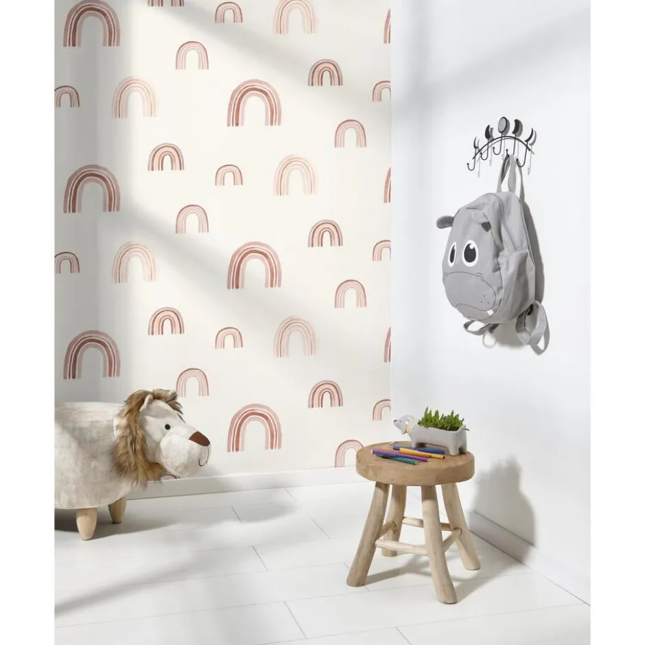 Wit vliesbehang met speelse regenbogen in bruine tinten. 53 cm breed. 10 meter per rol.