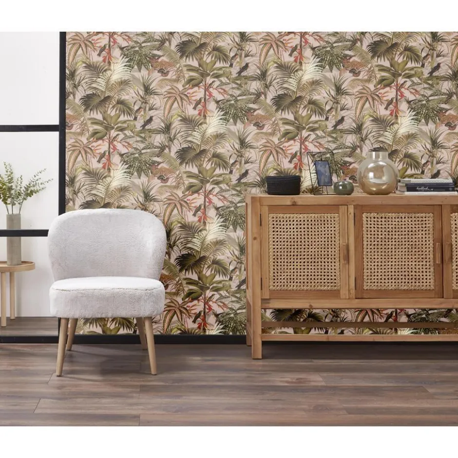 Lichtgroen vliesbehang met tropisch jungle dessin. 53 cm breed. 10 meter per rol.