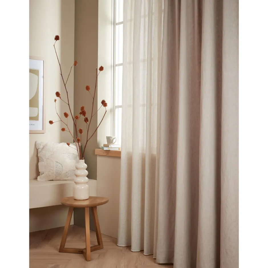 Soepelvallende naturelkleurige linnen gordijnstof. 140 cm breed.