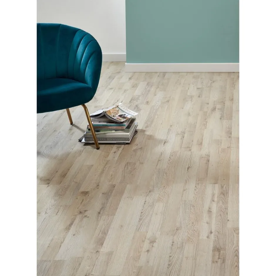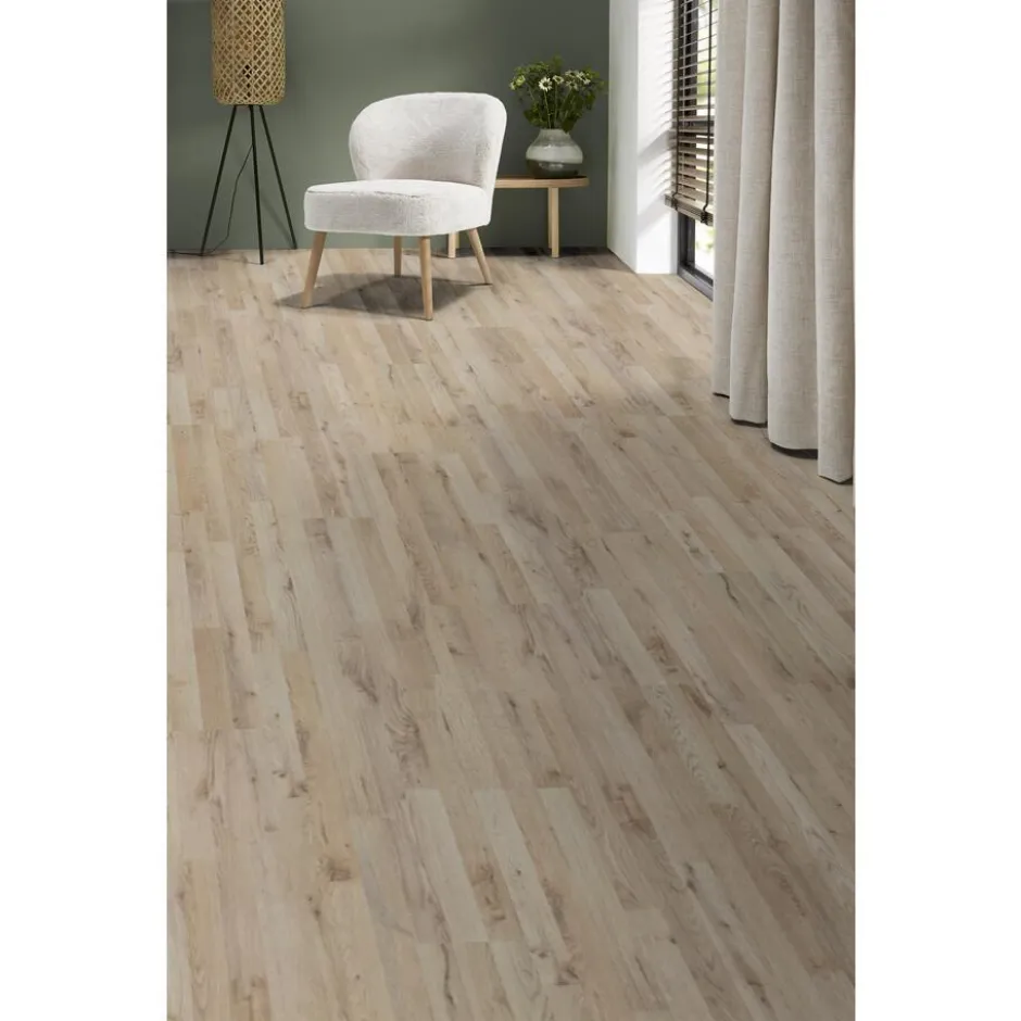 Laminaat met een dessin van licht eikenhout. 6 mm dik.