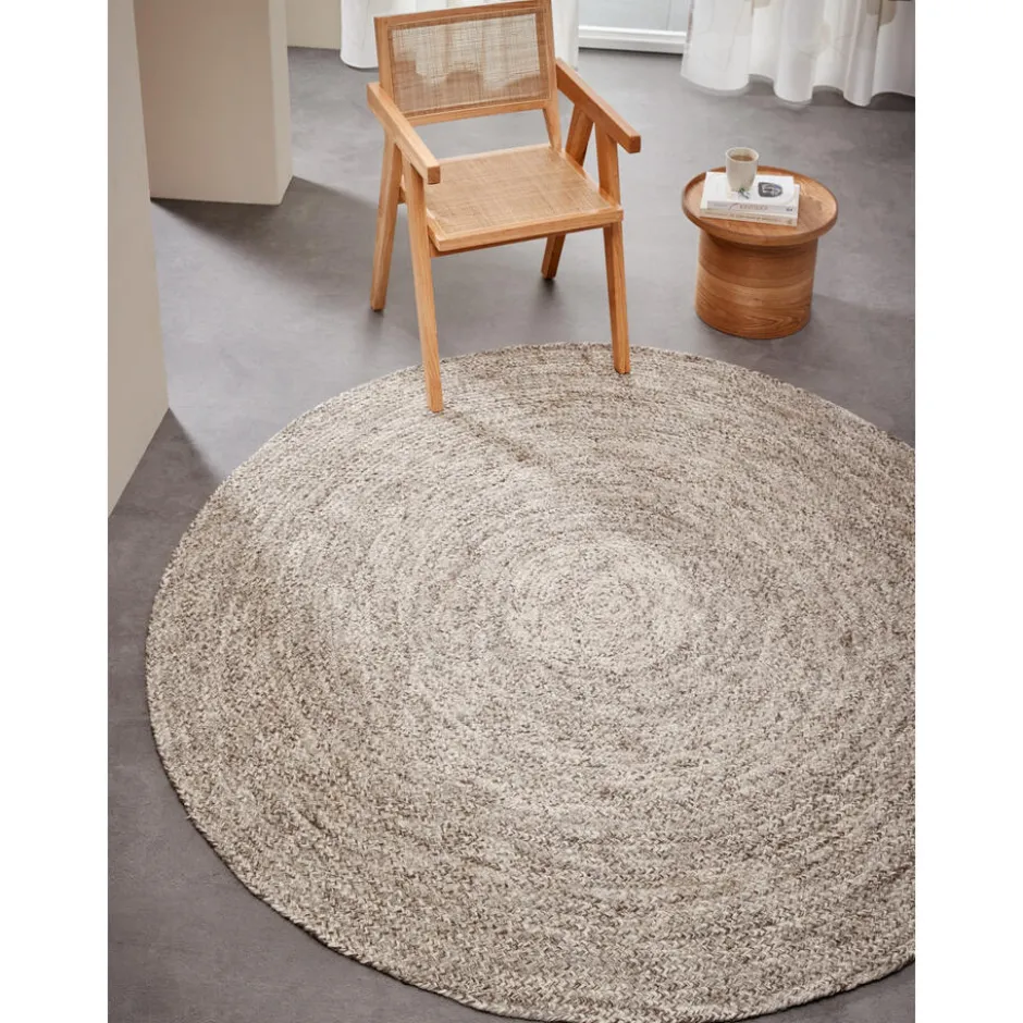 Rond handgeweven vloerkleed van wol met grijstinten. Veerkrachtig, geluiddempend en makkelijk in onderhoud. Voorzien van het Care & Fair keurmerk. 180 cm doorsnede.
