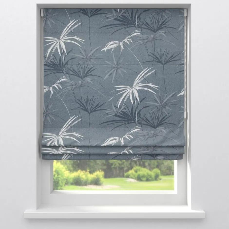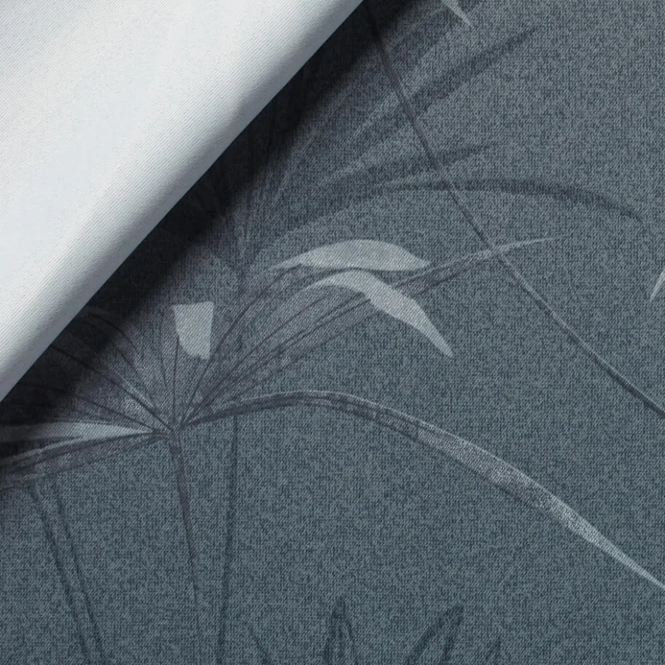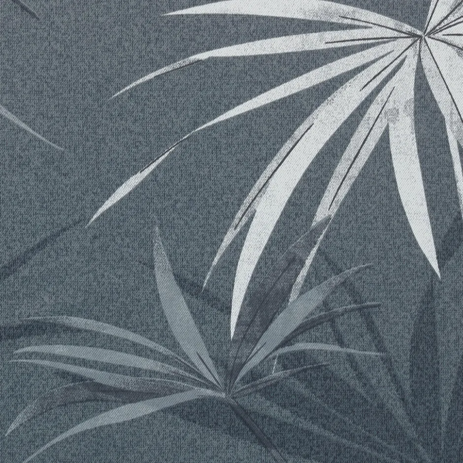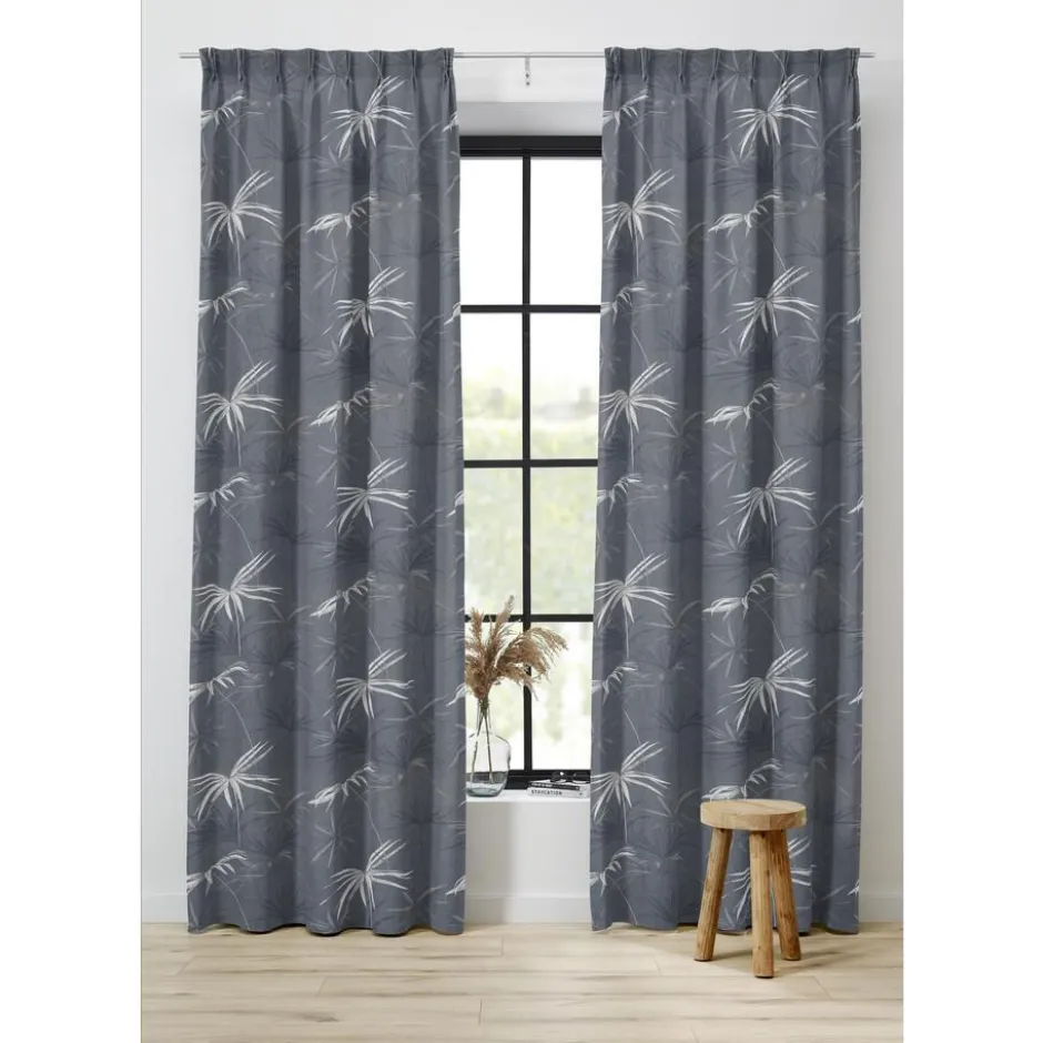 Luxe grijskleurige gordijnstof met palm design. Verduisterend. Zelf te wassen tot 30 graden. 138 cm breed.
