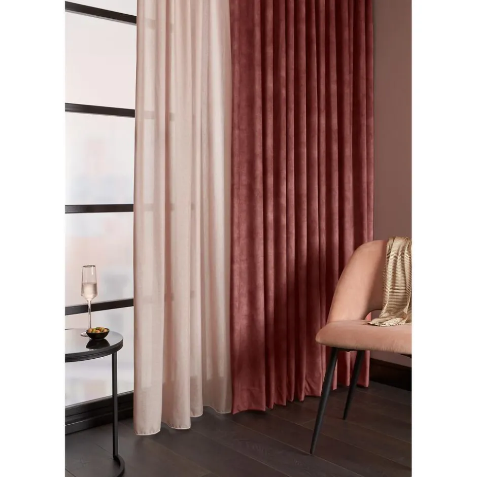 Transparante gordijnstof roze met zachte kleurmelange en matte uitstraling. 11% linnen. 300 cm breed.